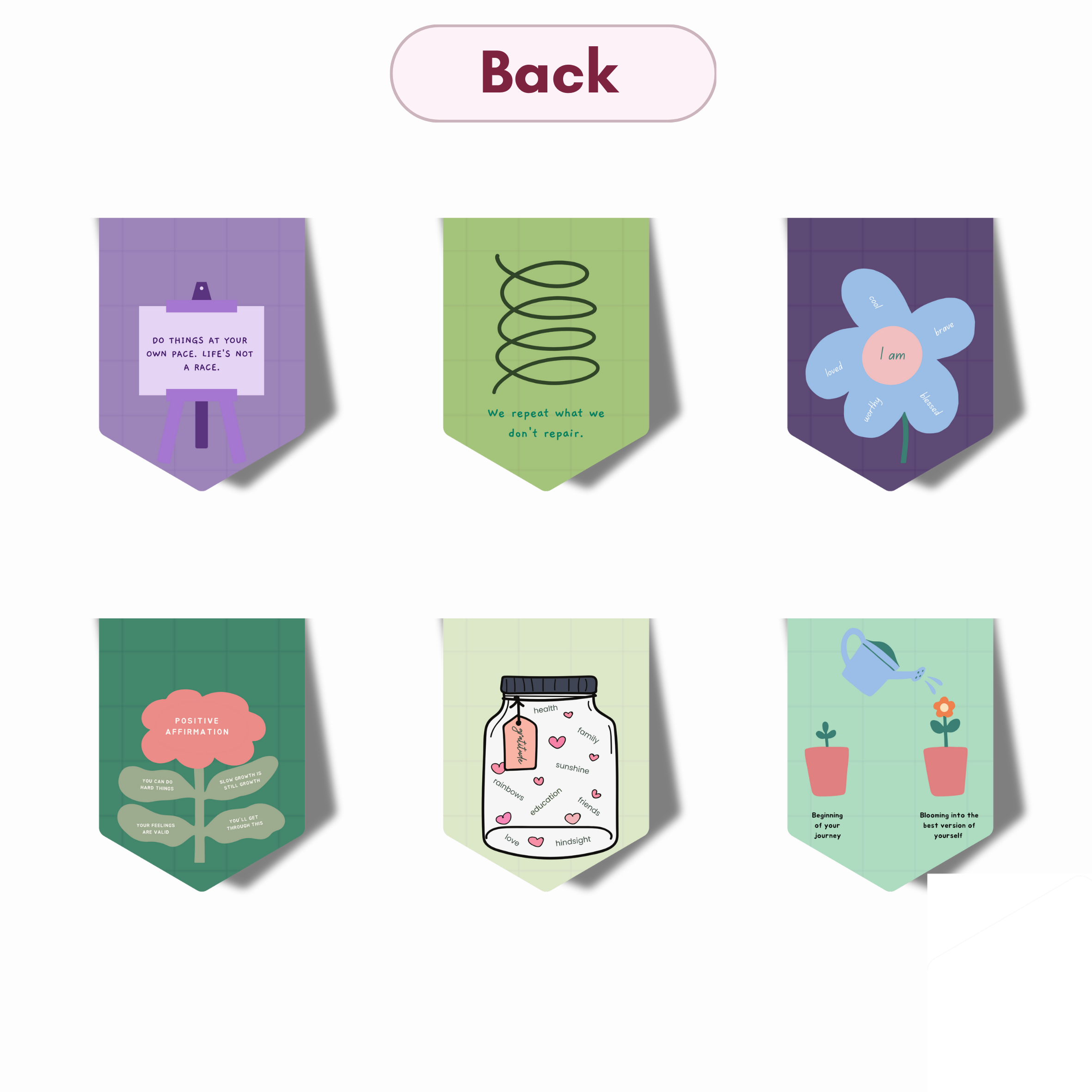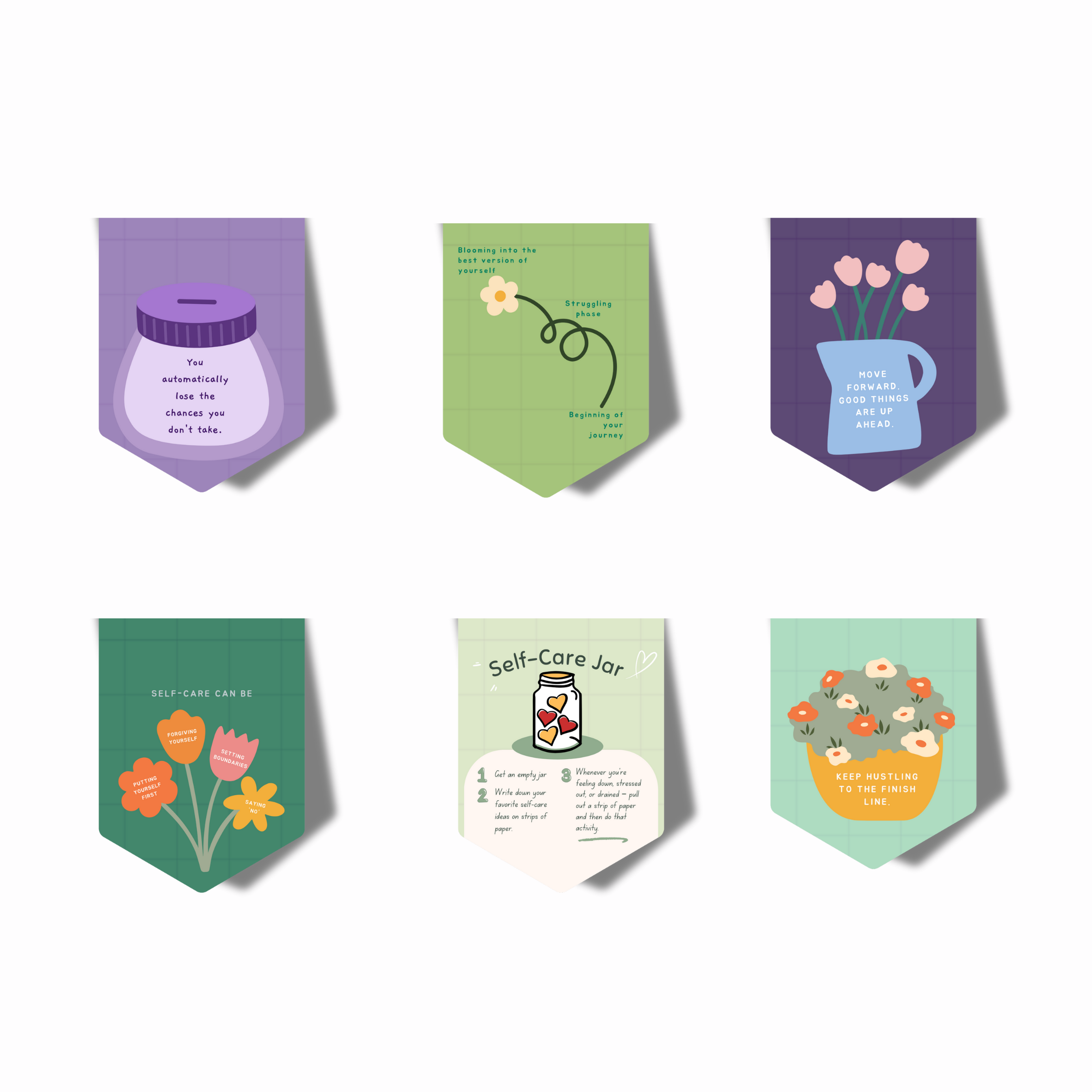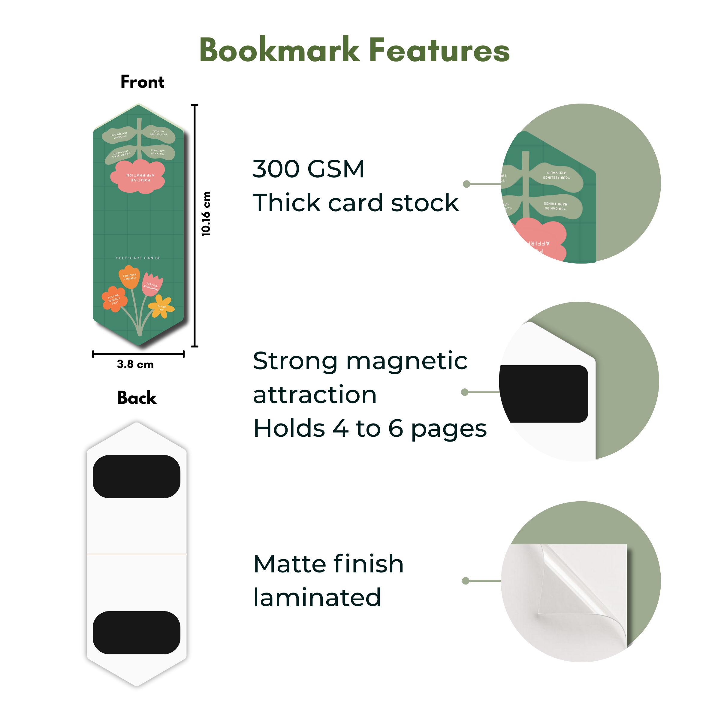 - SET OF 6 DESIGNS: Includes 6 magnetic Bookmarks with quotes featuring uplifting self-care and motivational quotes with colourful illustrations including flowers, jars, and inspiring messages