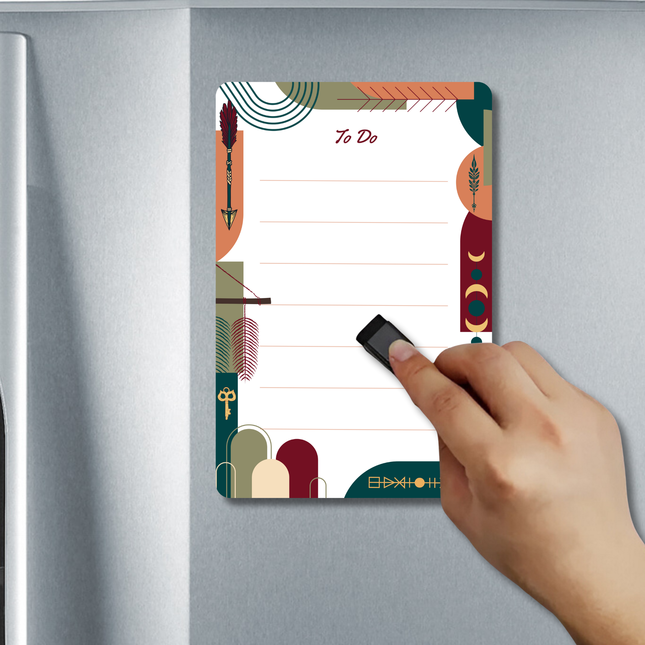 - VERSATILE USE: Reusable dry-erase surface with separate sections for notes and to-do lists, featuring stylish boho-inspired artwork