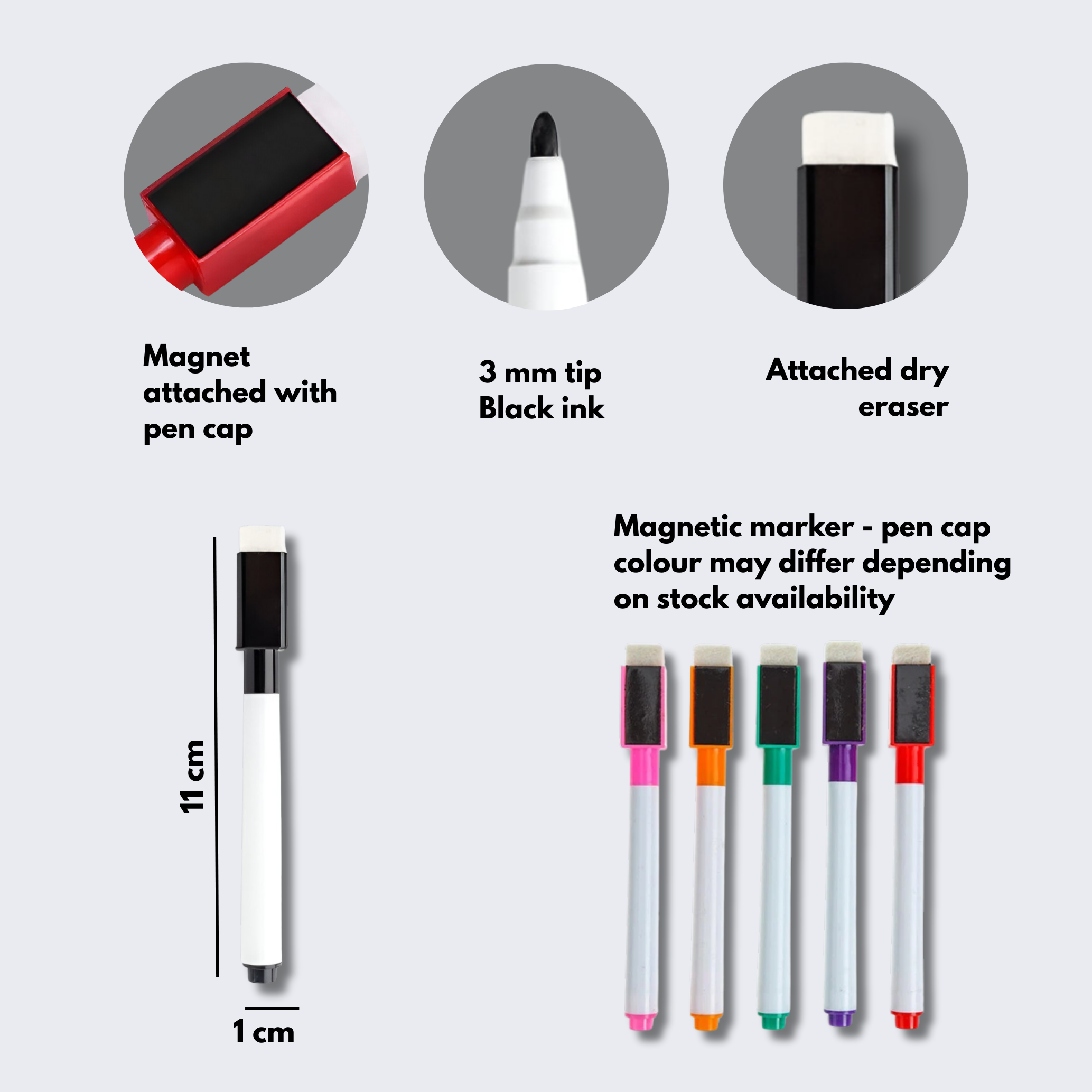 - WRITING TOOLS: Includes 2 black ink markers with 3mm tips and attached dry erasers, allowing for smooth writing and quick corrections