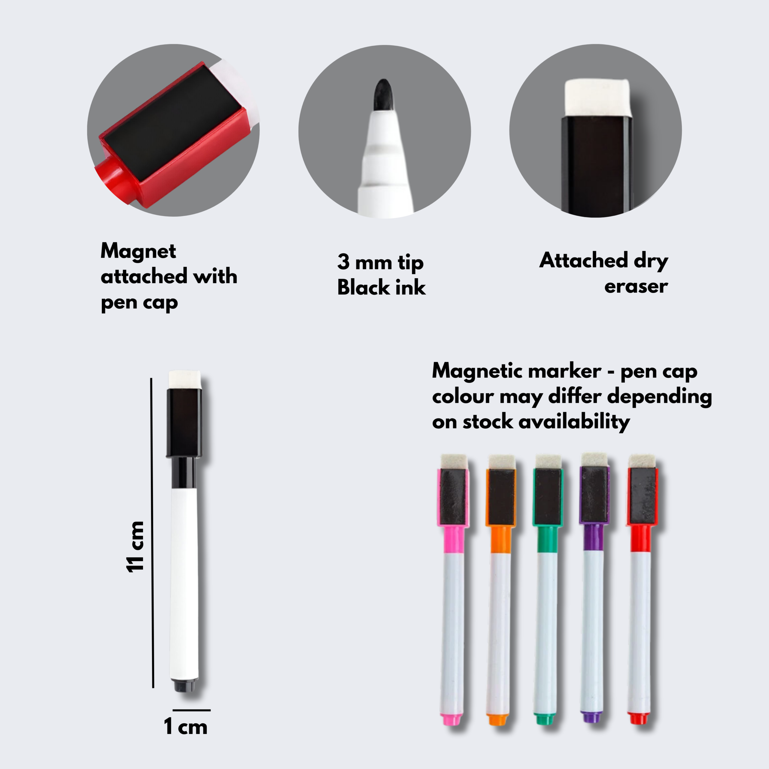 • INCLUDED ACCESSORIES: Comes with 2 magnetic markers featuring 3 mm black ink tips and convenient dry erasers attached to pen caps