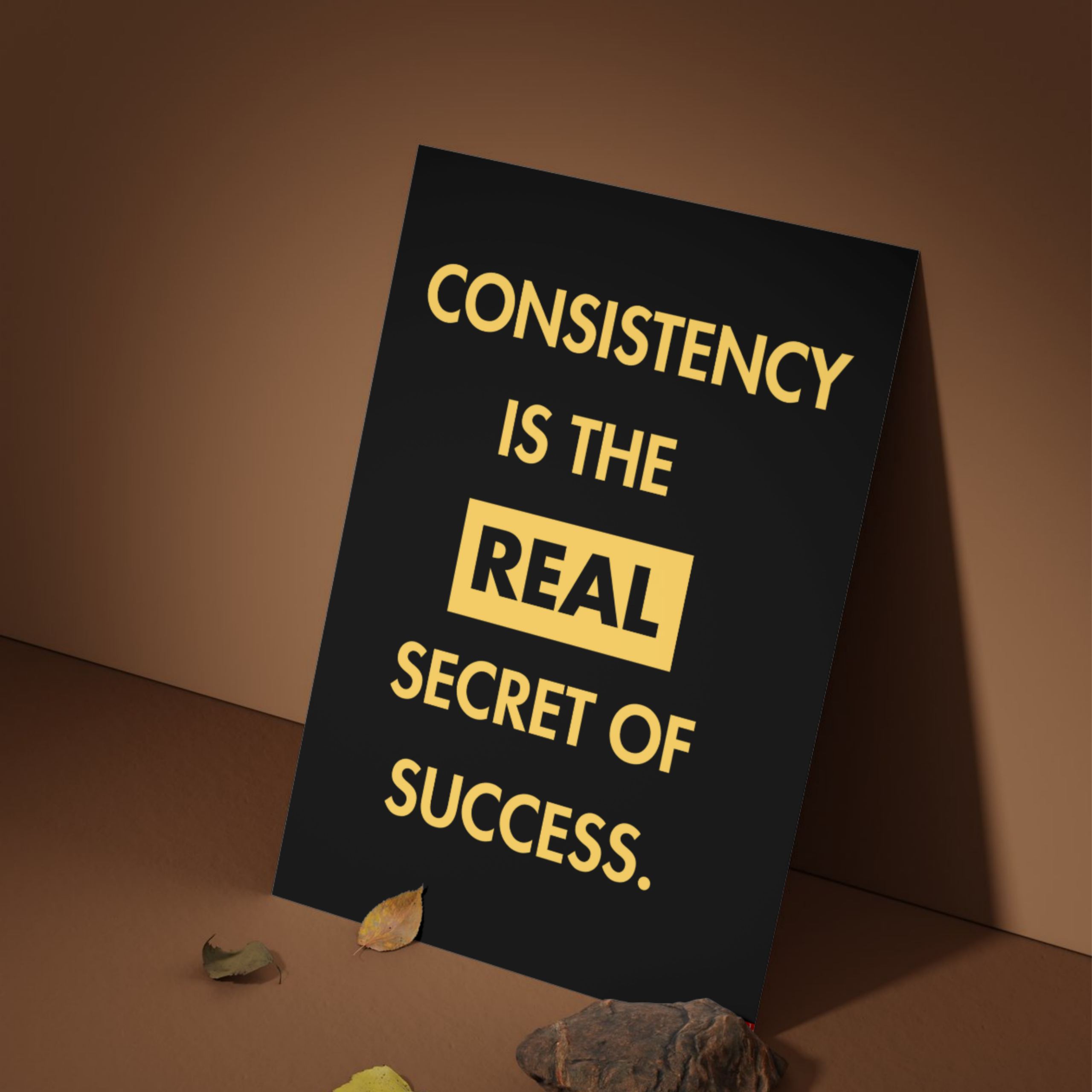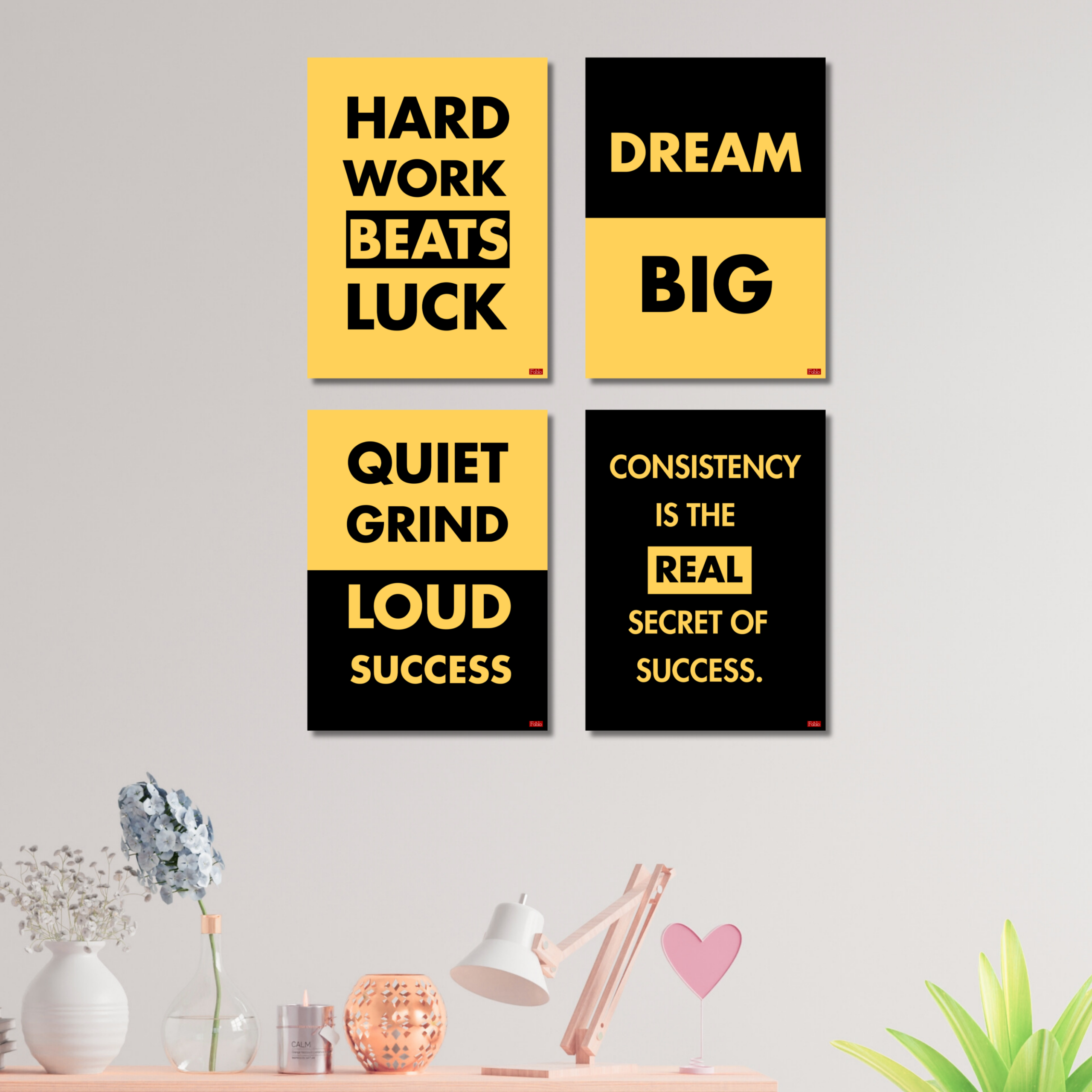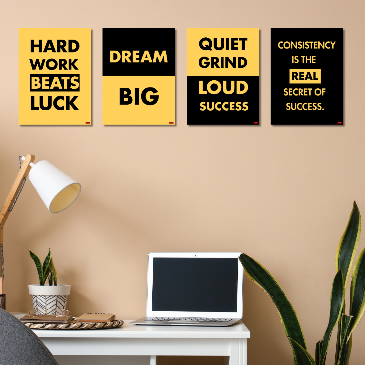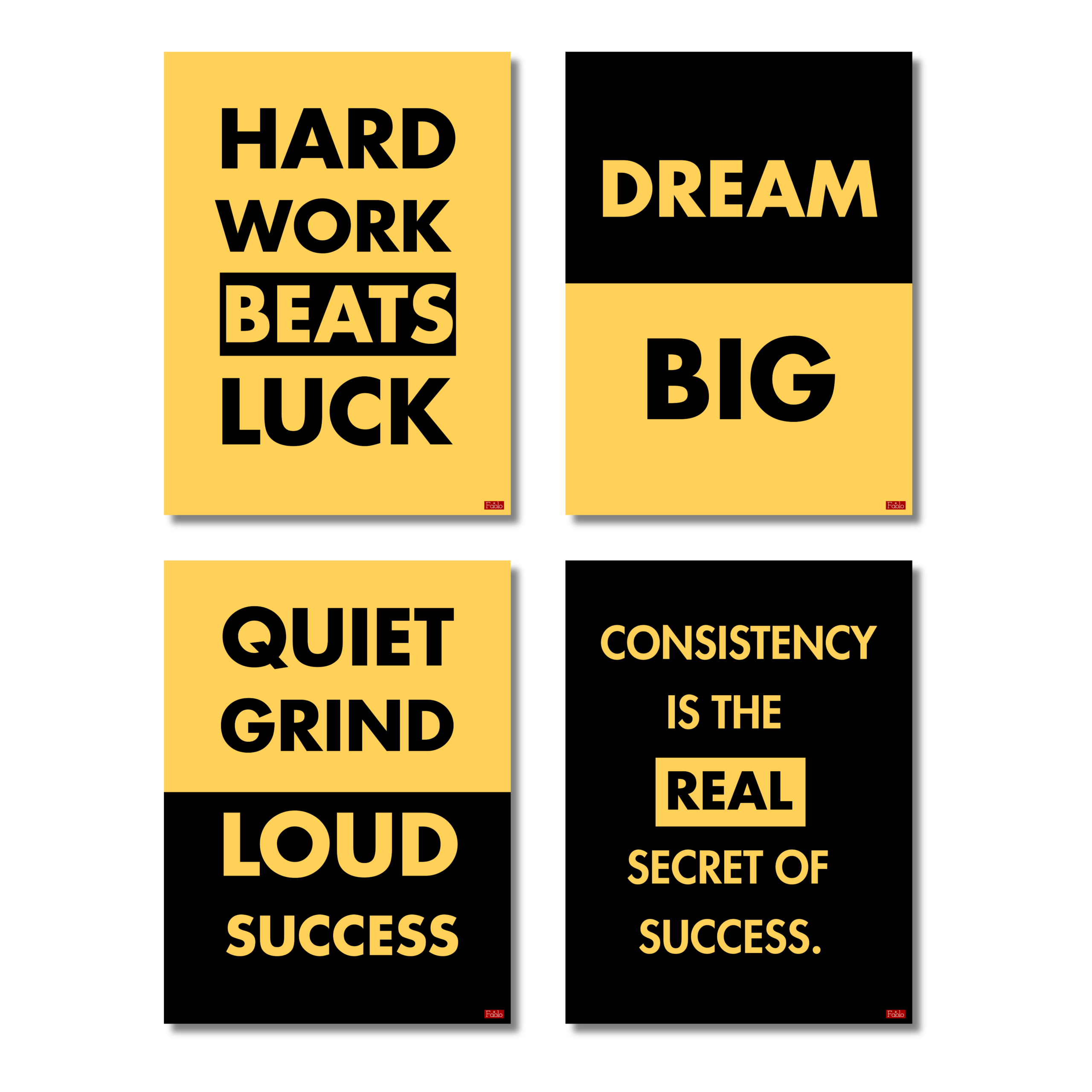 - SET OF 4 MOTIVATIONAL POSTERS: Includes four bold black and yellow quote posters — Hard Work Beats Luck, Dream Big, Quiet Grind Loud Success, and Consistency is the Real Secret of Success.