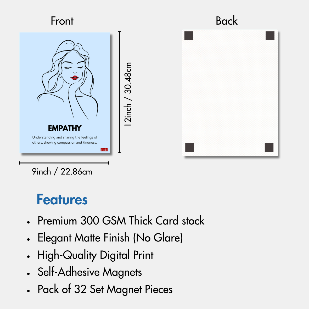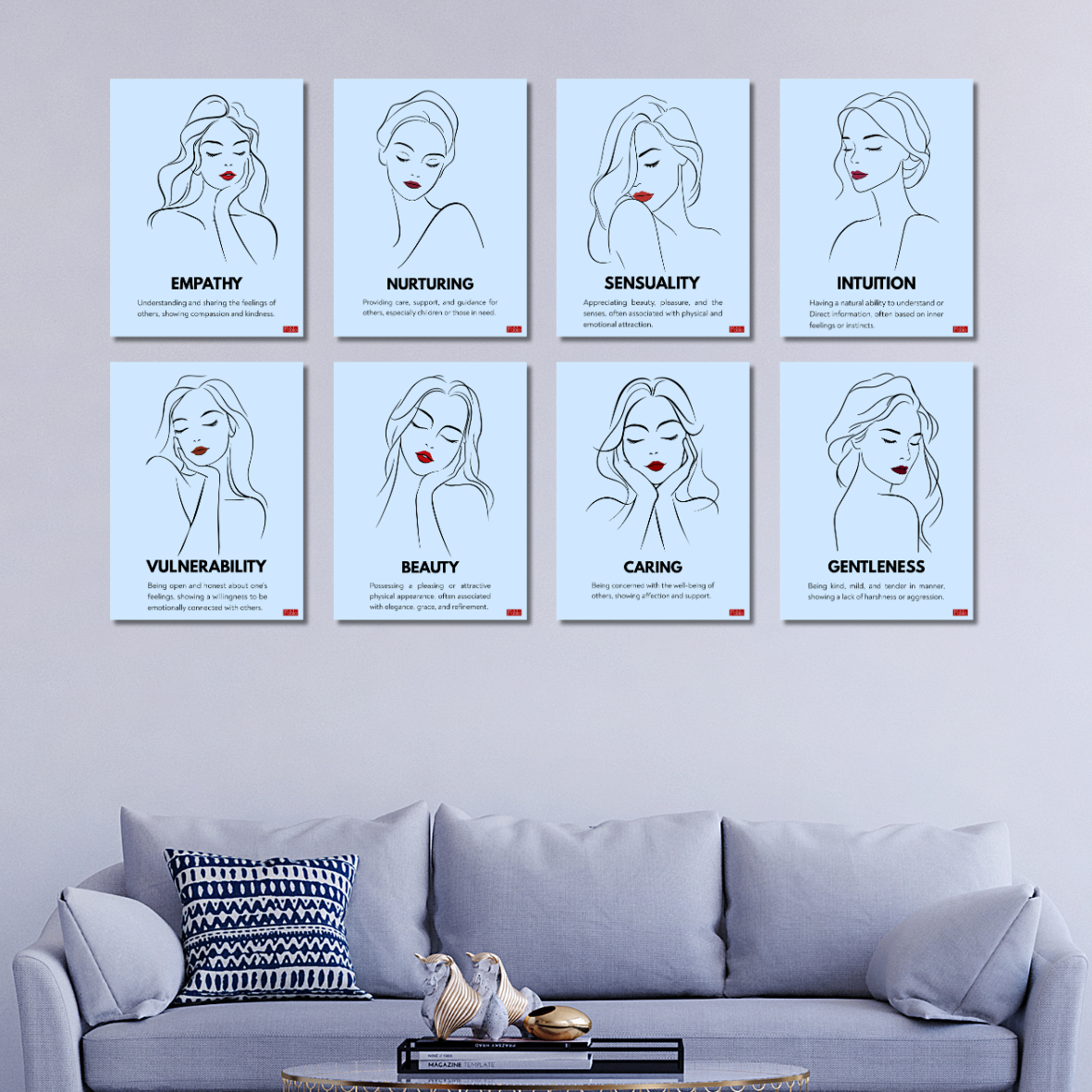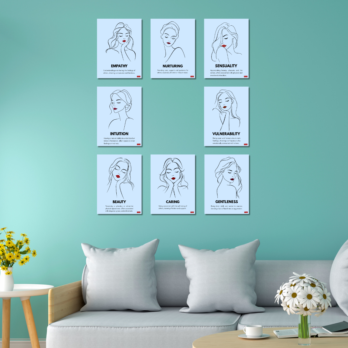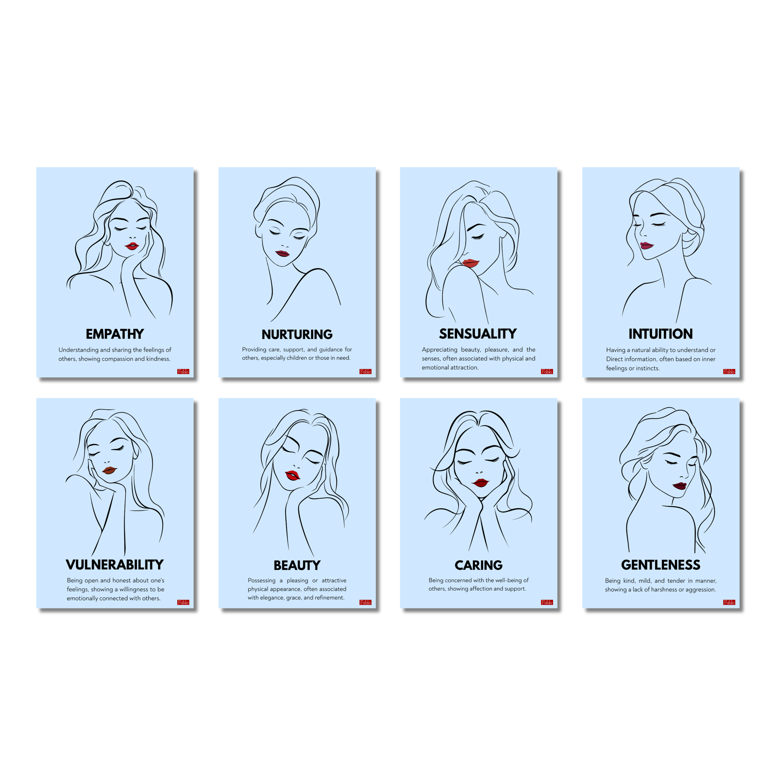 - FEMININE EMPOWERMENT THEME: Set of 32 magnetic aesthetic wall posters featuring elegant line-art illustrations of women with empowering themes such as Empathy, Nurturing, Sensuality, Intuition, Vulnerability, Beauty, Caring, and Gentleness.