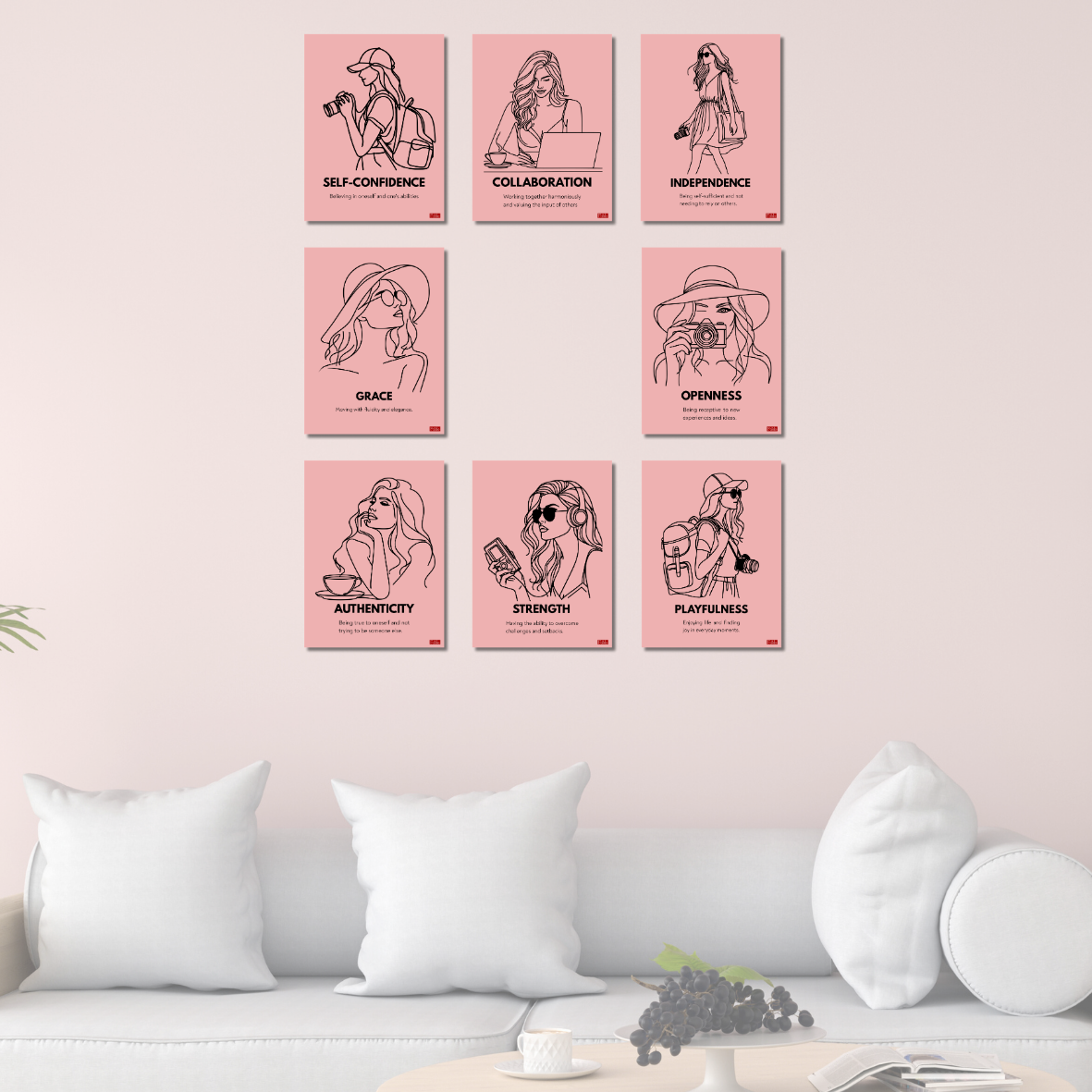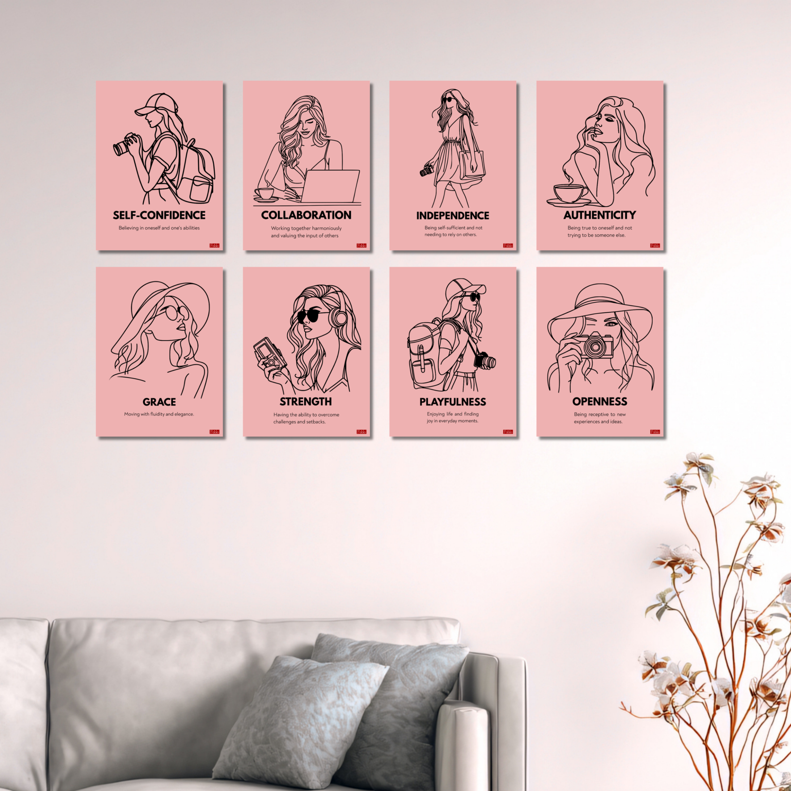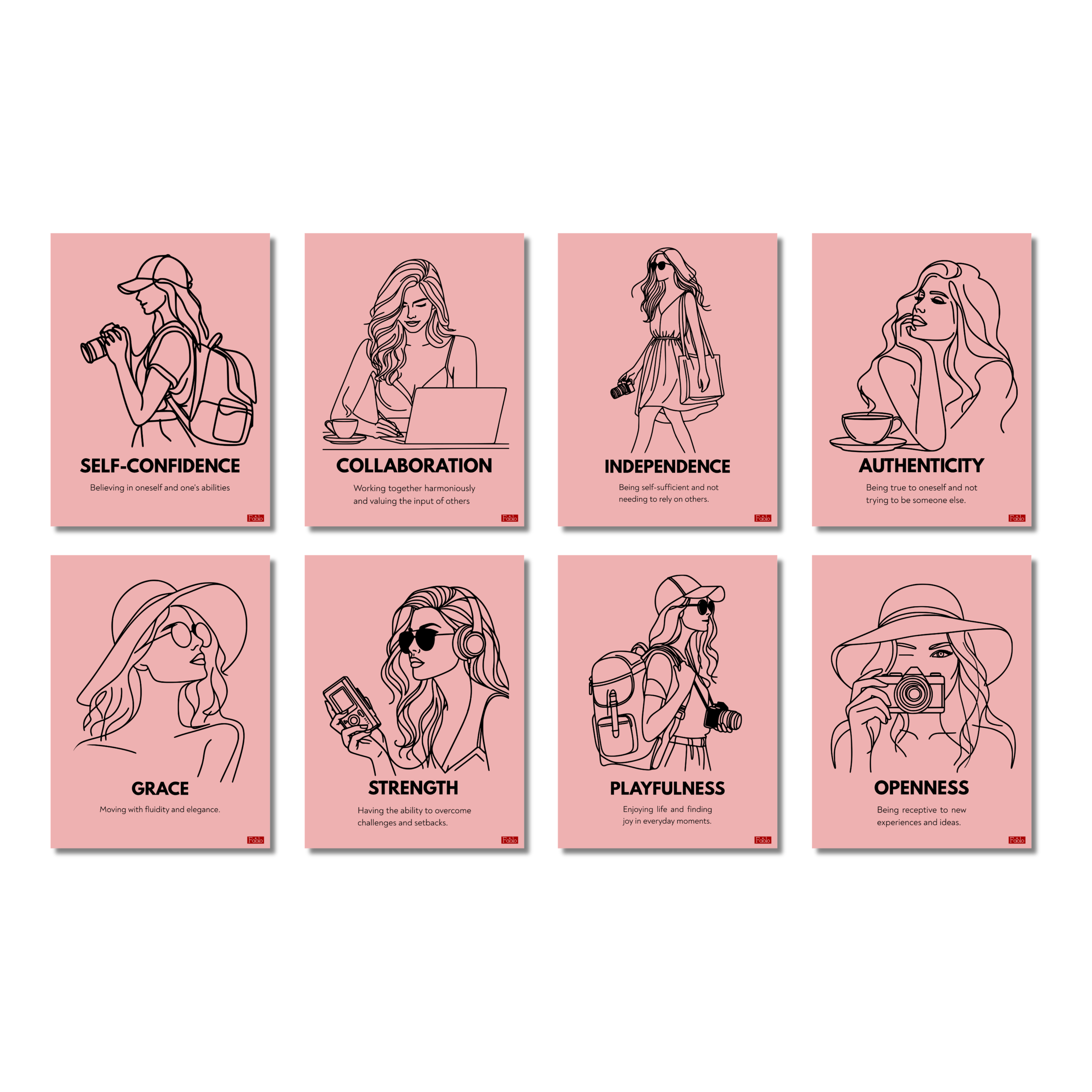 - EMPOWERMENT THEME: Set of 8 unique designs featuring empowering values like Strength, Self-Confidence, Grace, Collaboration, Independence, Authenticity, Playfulness, and Openness,wall posters aesthetic.