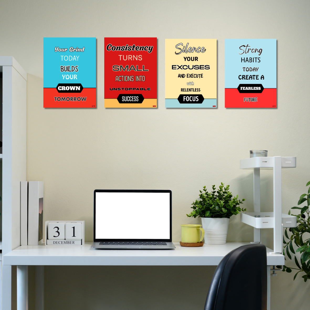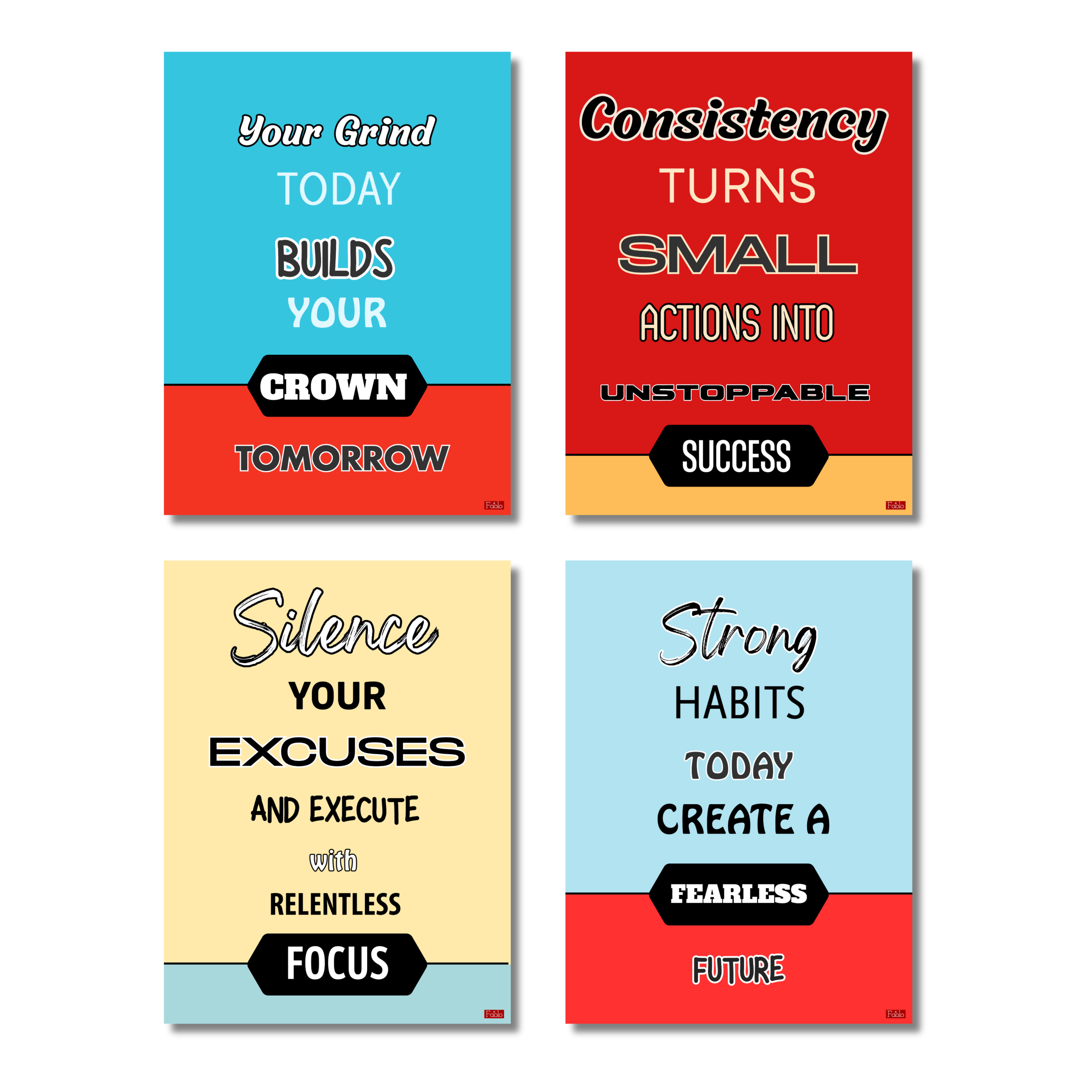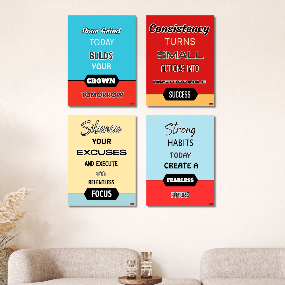 • SET OF 4 MOTIVATIONAL POSTERS: Includes four bold motivational poster quotes prints — Your Grind Today Builds Your Crown Tomorrow, Consistency Turns Small Actions Into Unstoppable Success, Silence Your Excuses and Execute with Relentless Focus, and Strong Habits Today Create a Fearless Future