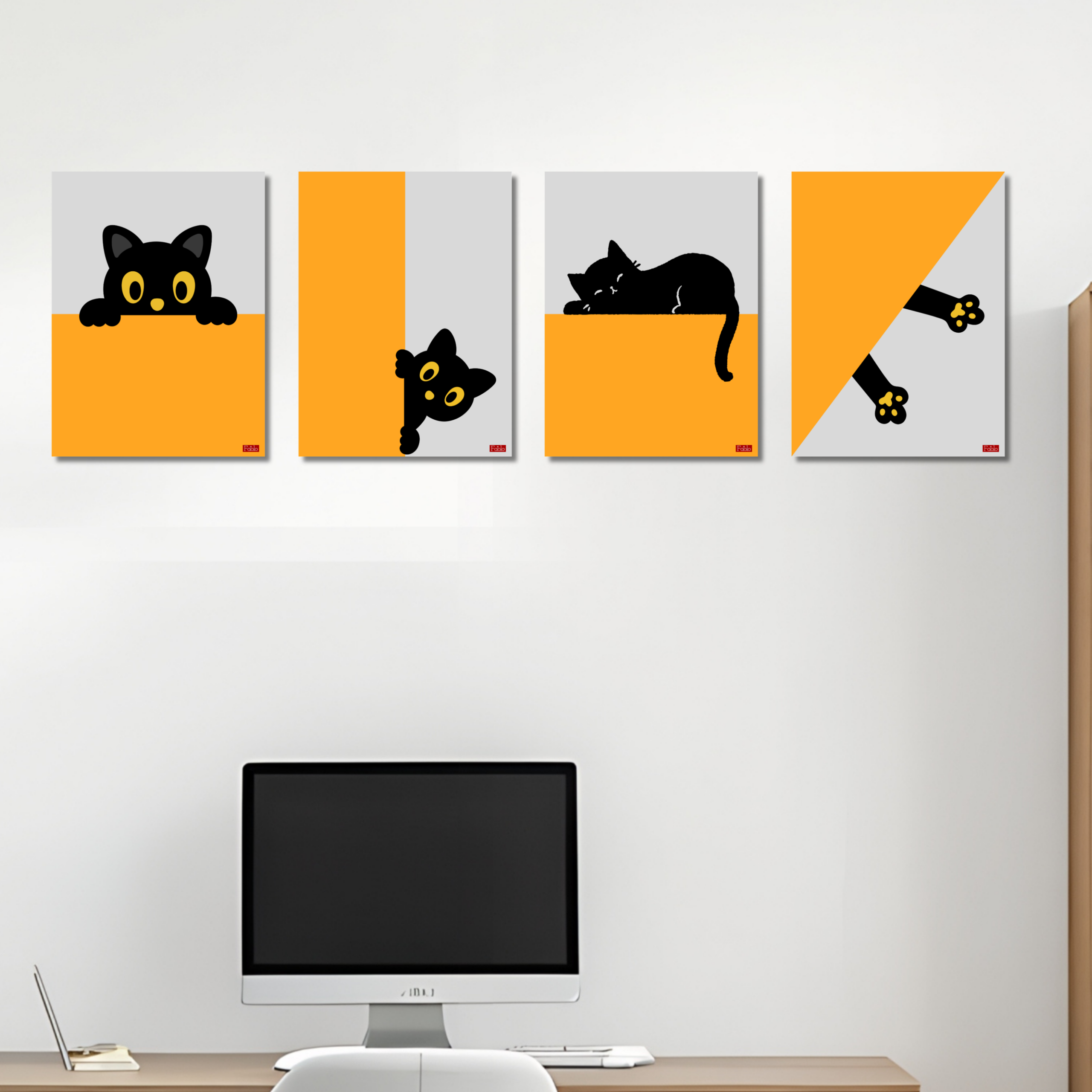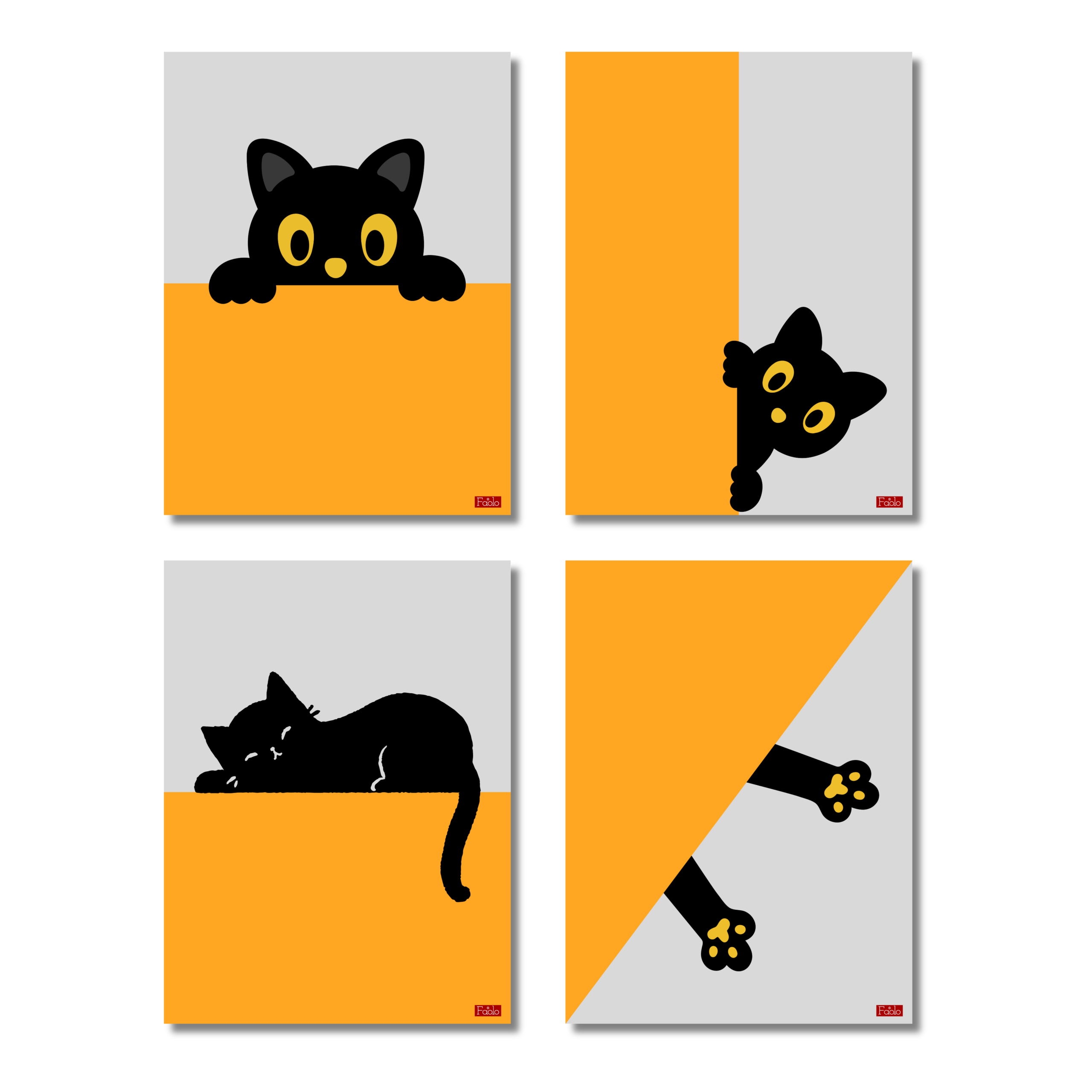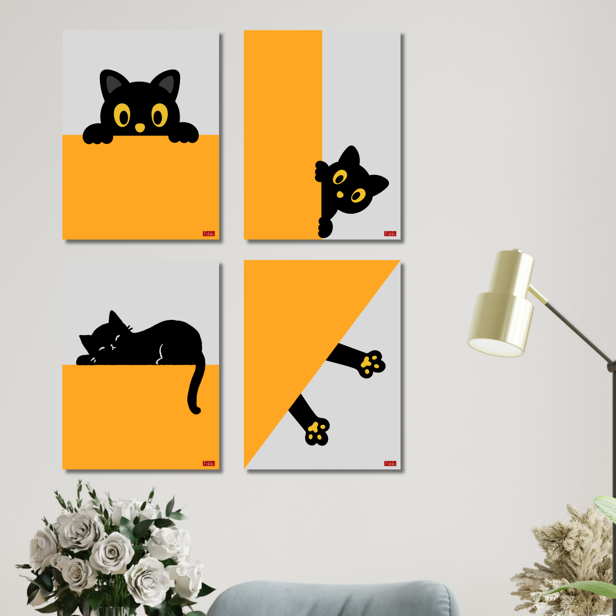 - CUTE CAT DESIGN: Set of 4 wall posters featuring charming black cat illustrations in a playful orange and grey colour scheme, perfect for cat lovers