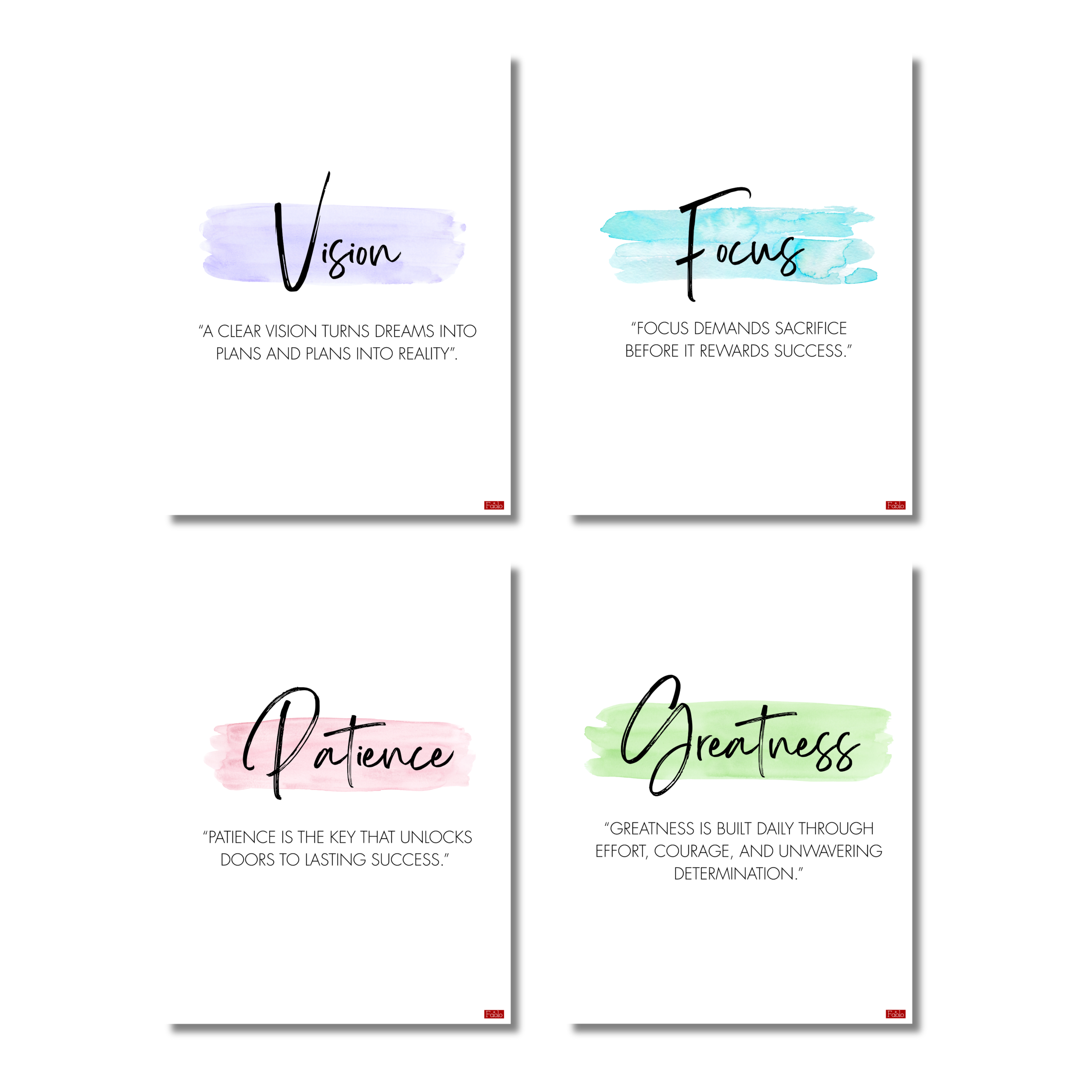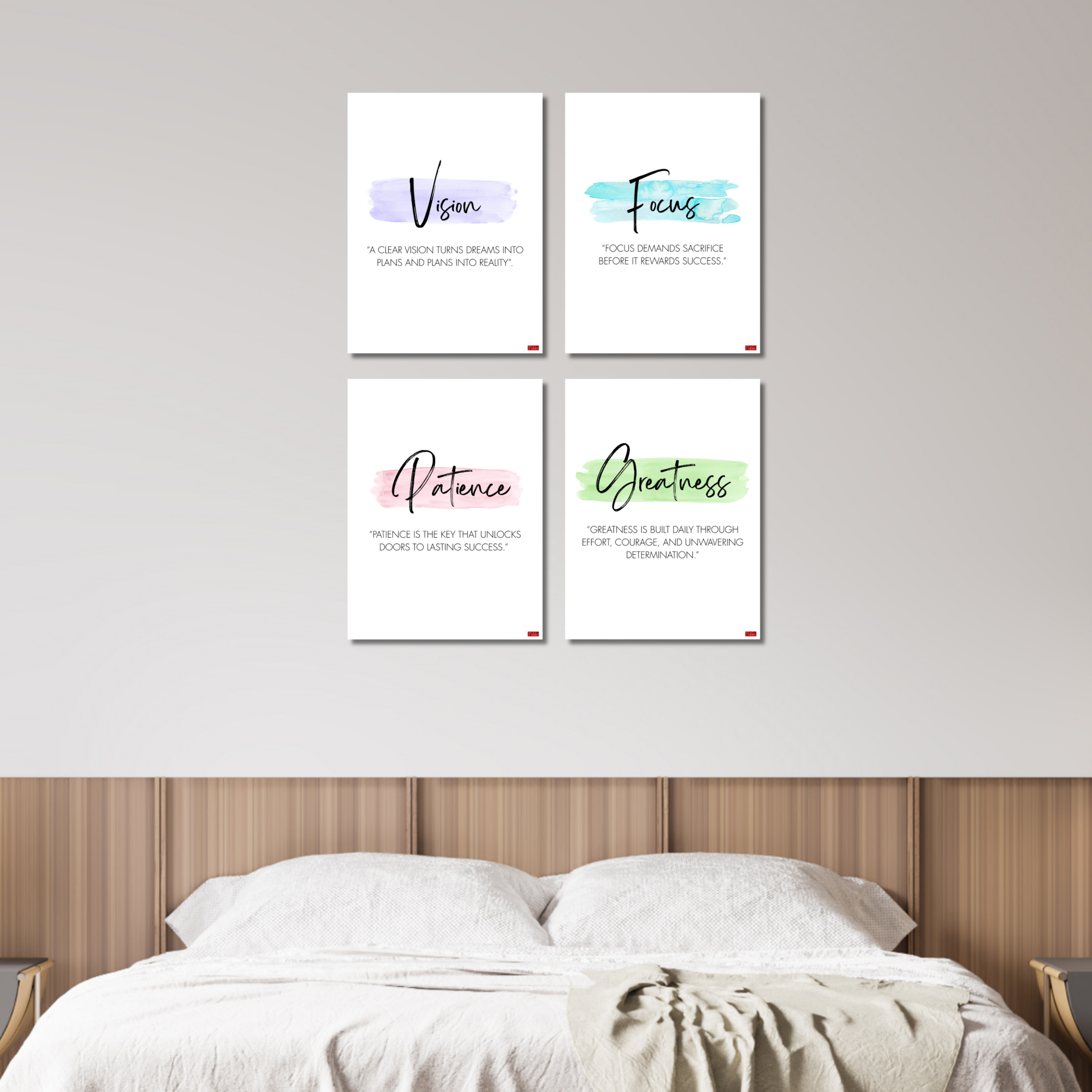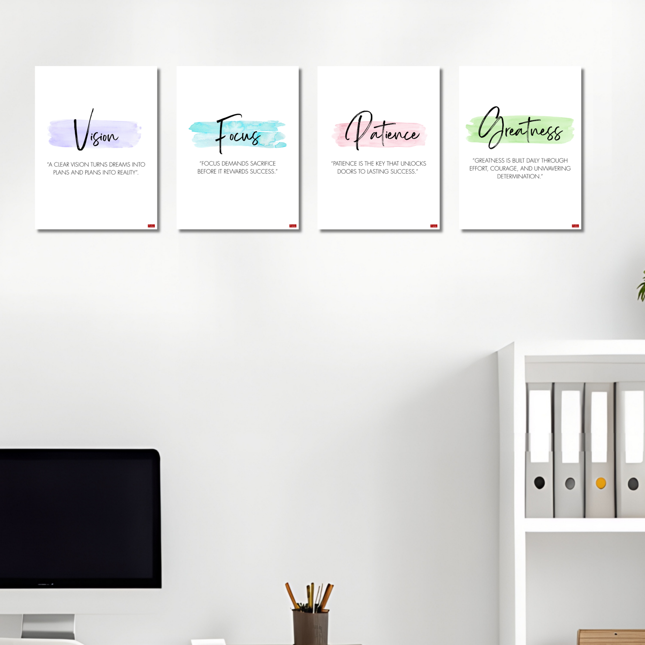 • SET OF 4 MOTIVATIONAL POSTERS: Includes Vision, Focus, Patience, and Greatness prints,motivation poster, each featuring an inspiring quote and elegant watercolour brushstroke design.